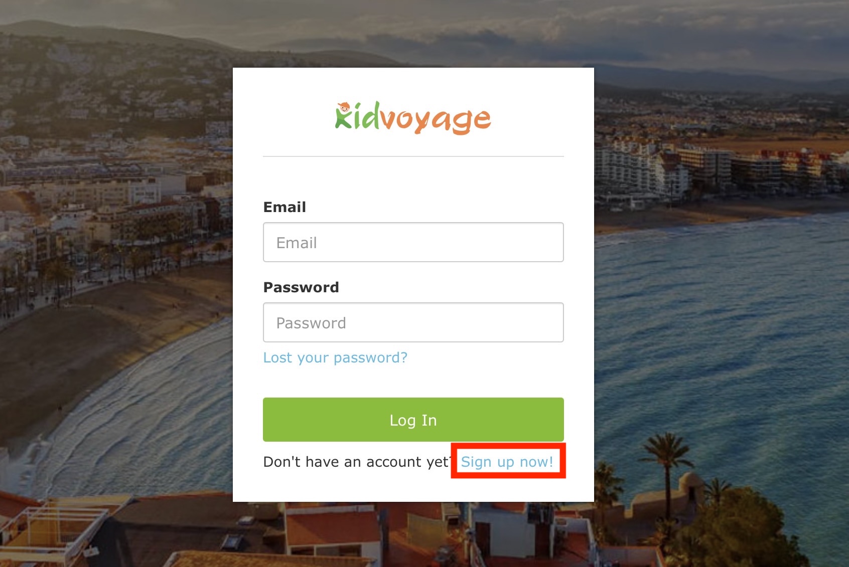 Kickstart your journey by registering on Kidvoyage. In the top right corner, click Account, to access the Log In screen.